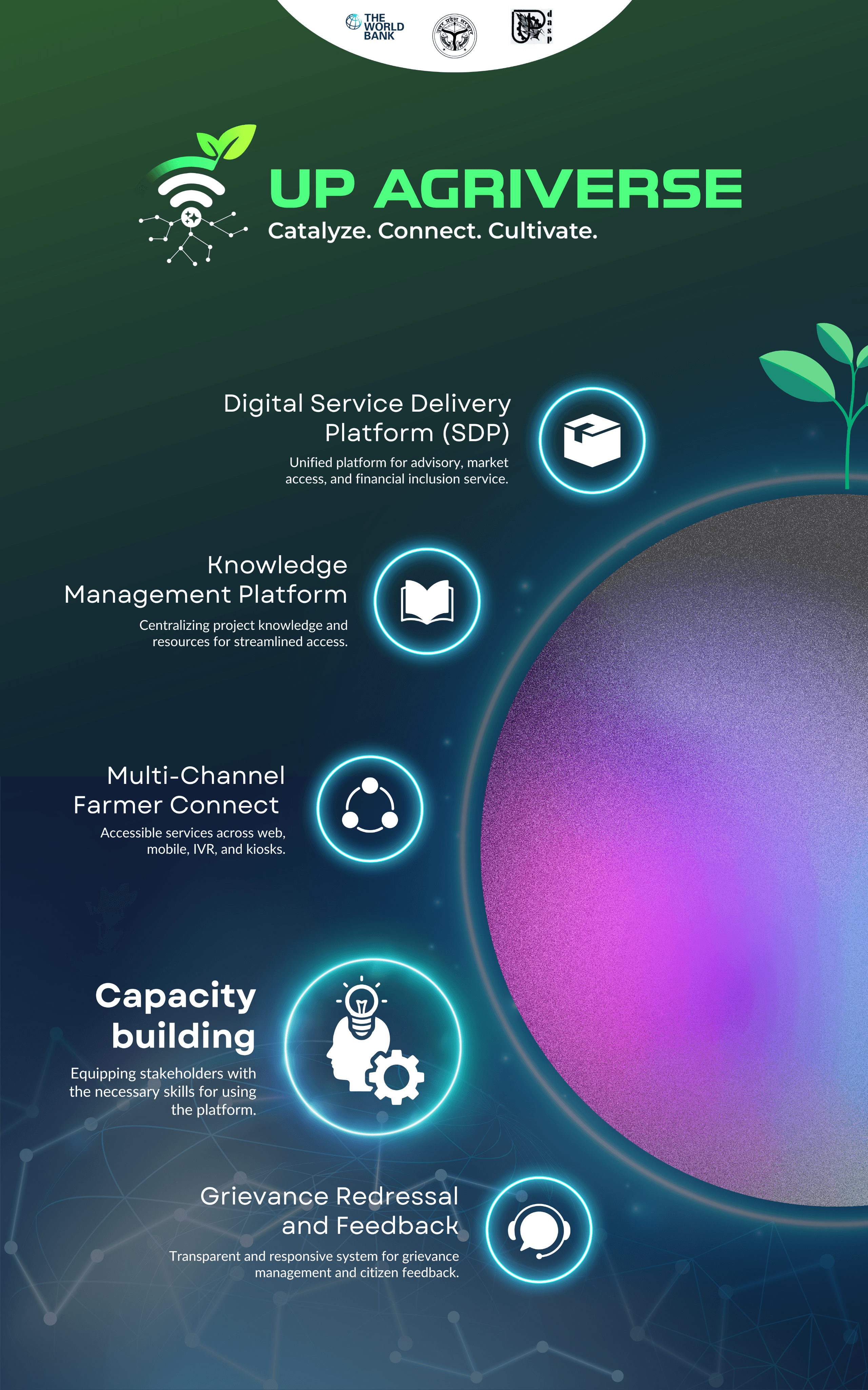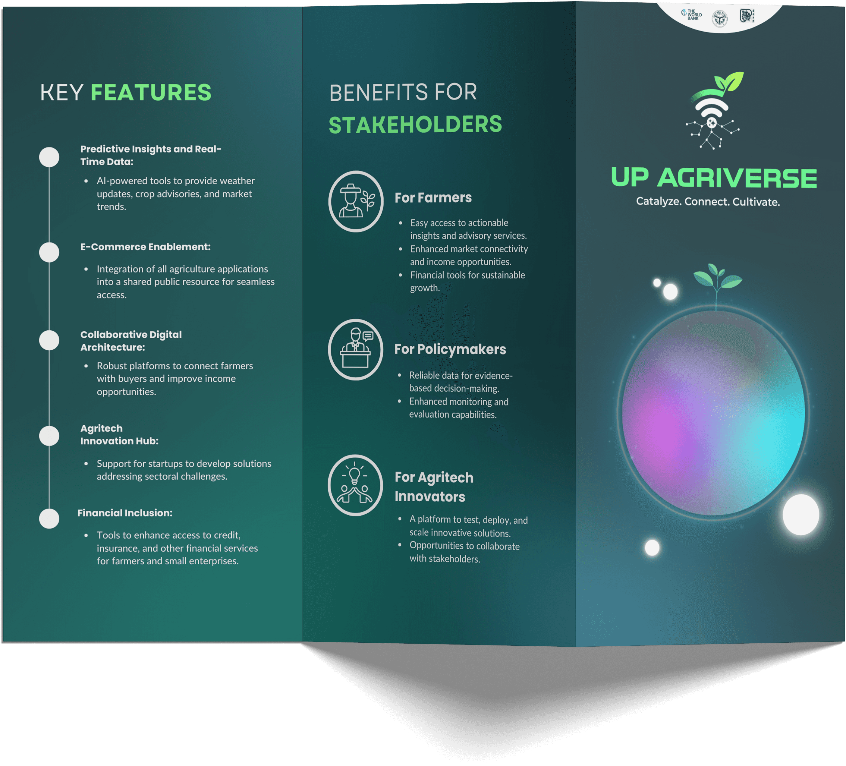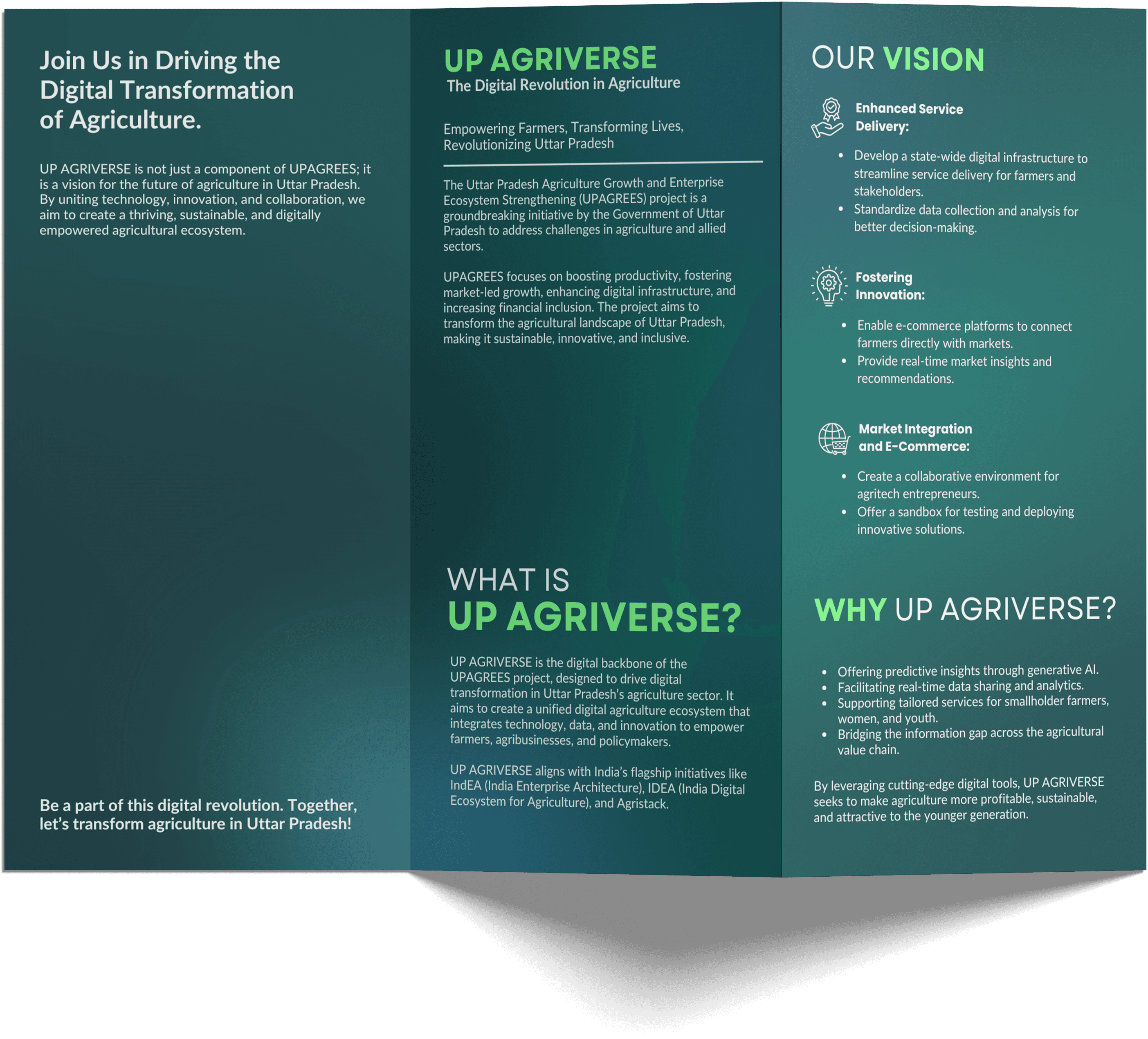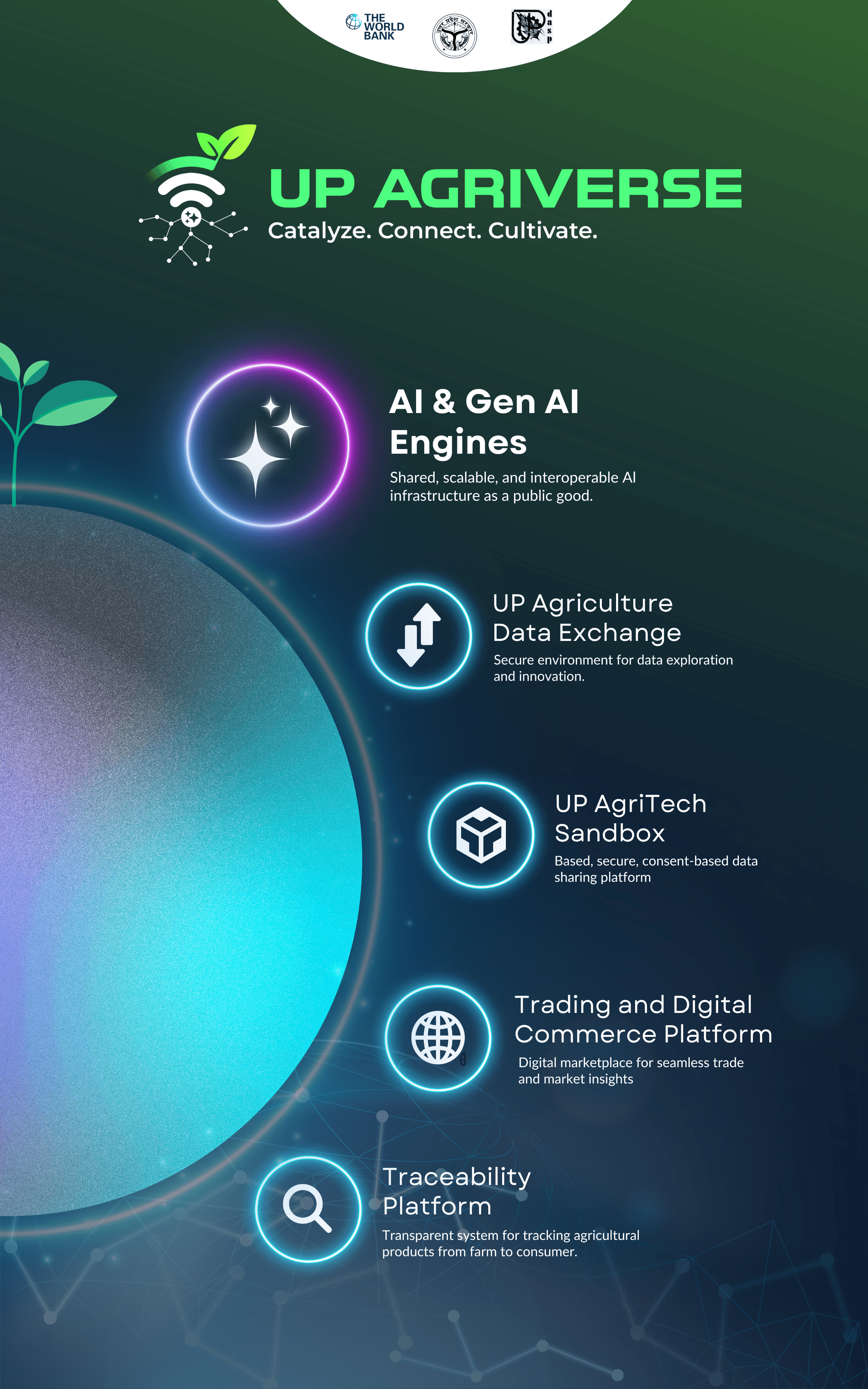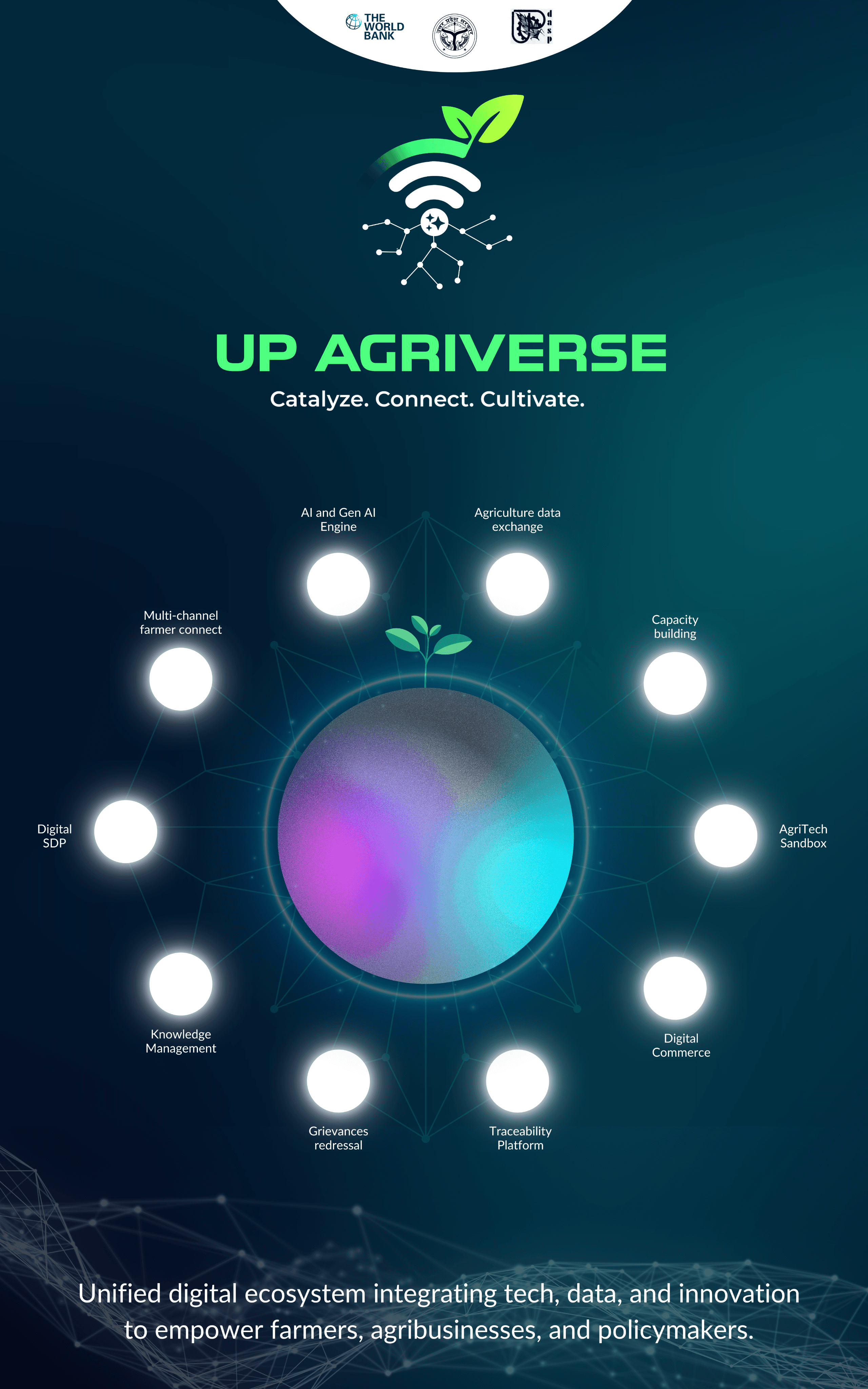 UP Agriverse is a futuristic, tech-driven ecosystem designed to revolutionize agriculture launched by UP DASP - UP AGREES and funded by World Bank. Built around 10 key components, the platform integrates AI, data exchange, agritech sandboxes, and digital services to empower farmers and stakeholders.