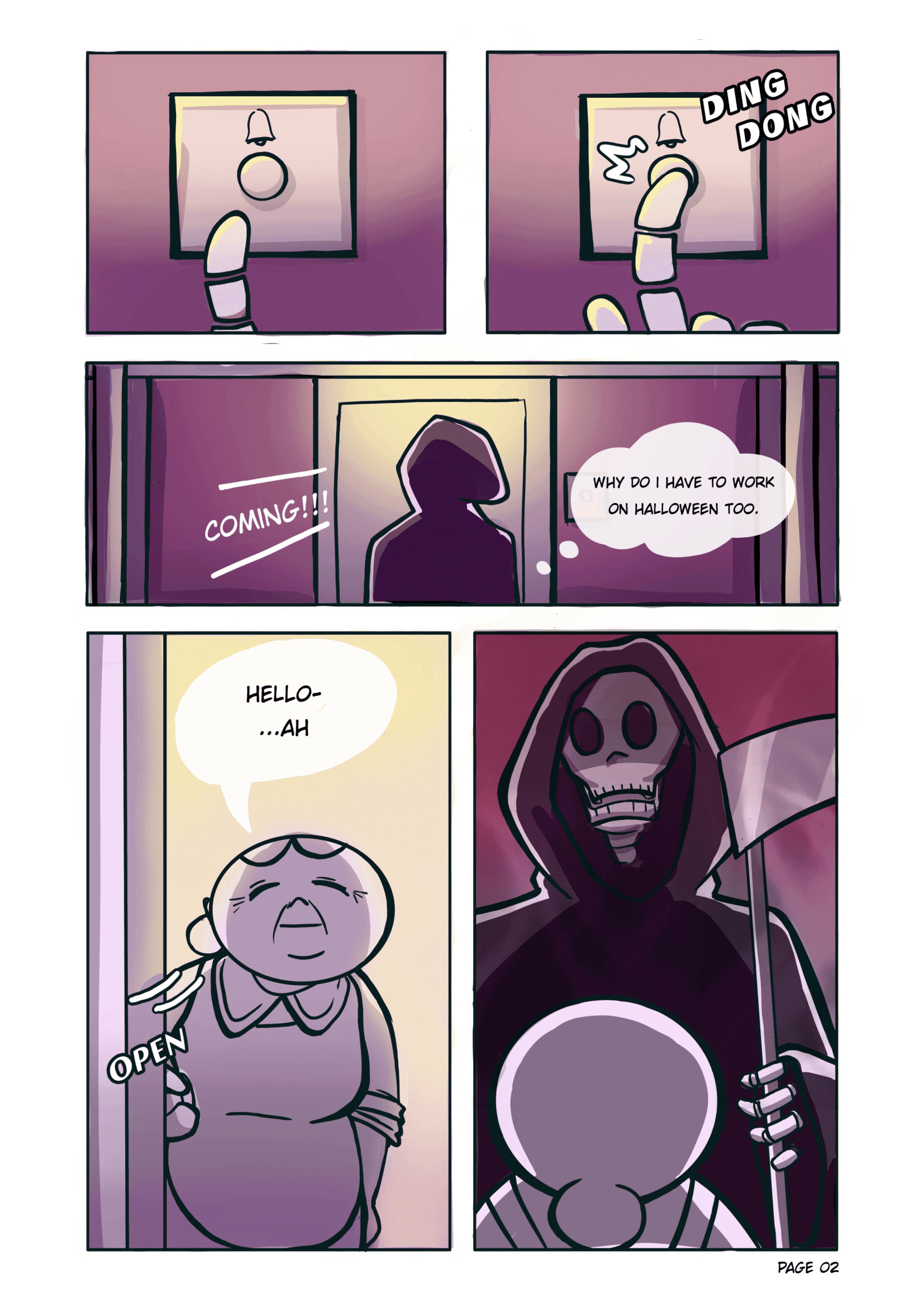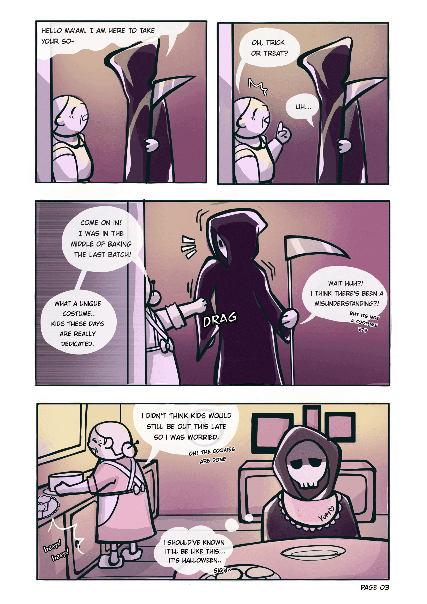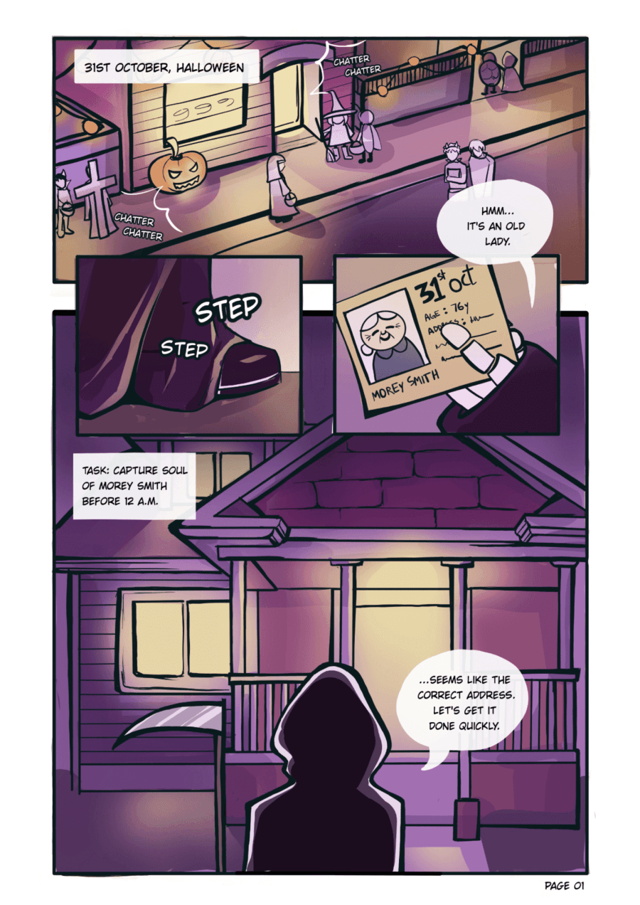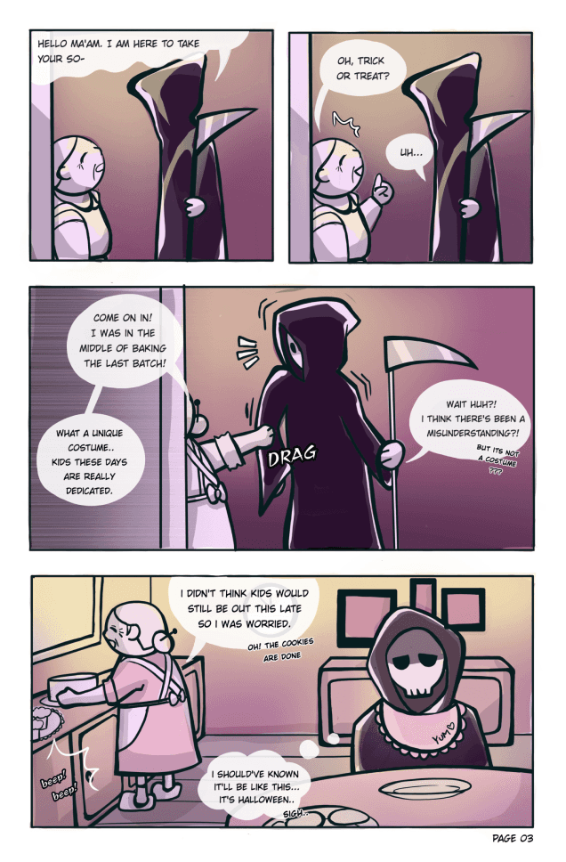 A short comic about a grim reaper vising an old lady on Halloween to take her soul where a misunderstanding leads to a wholesome interaction.