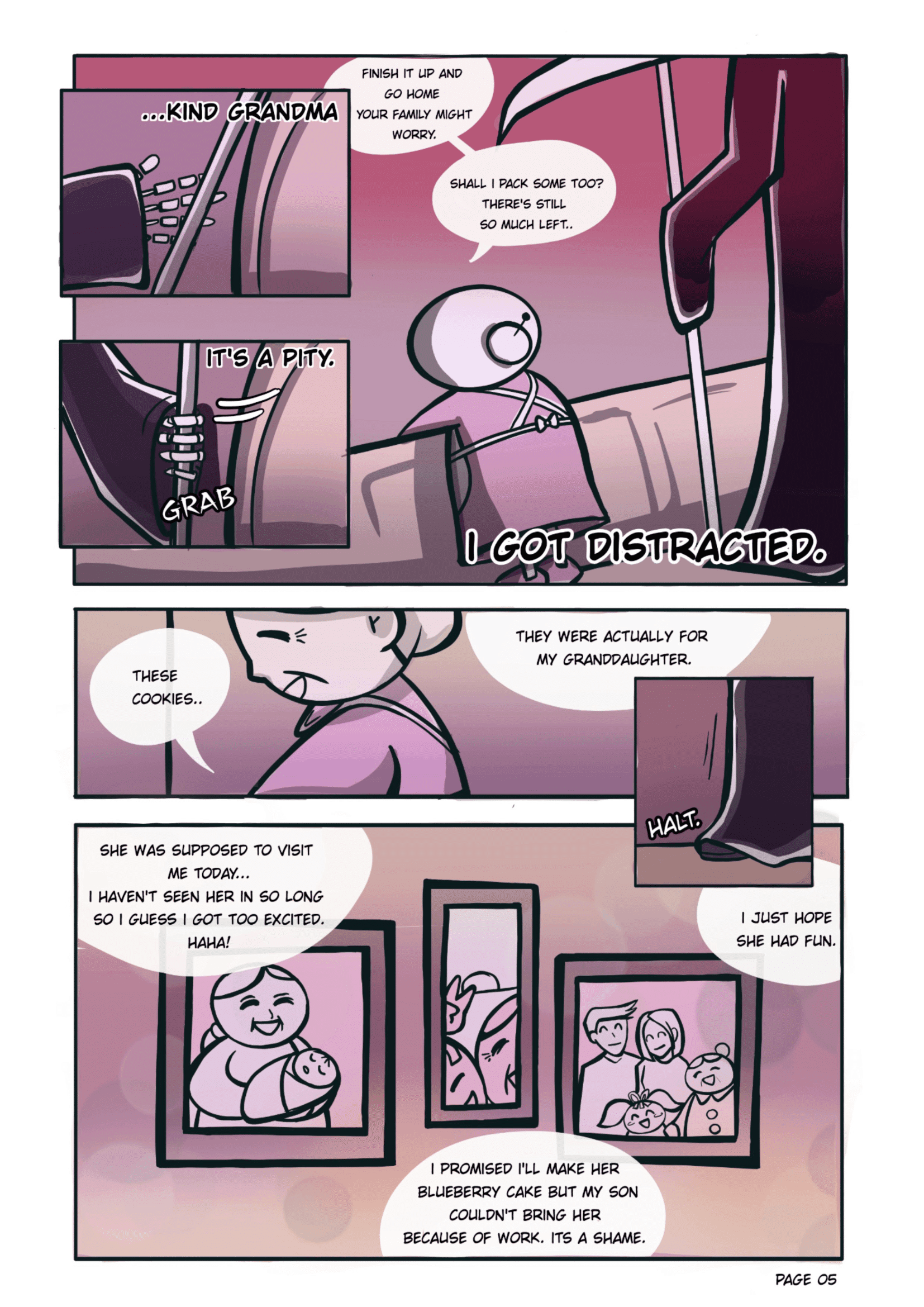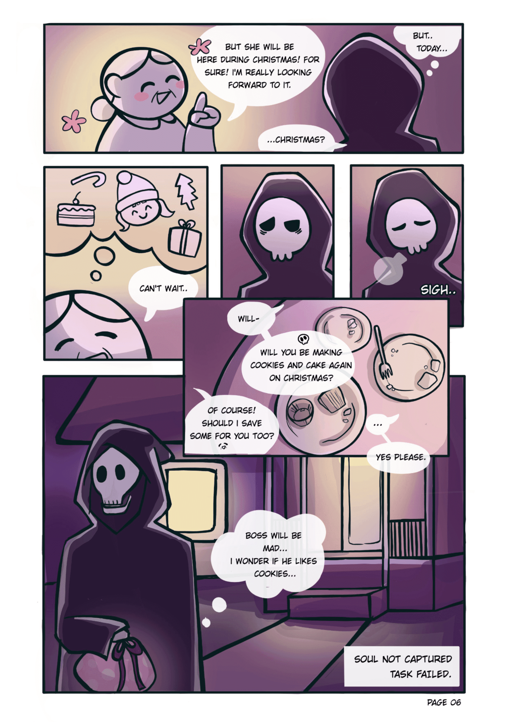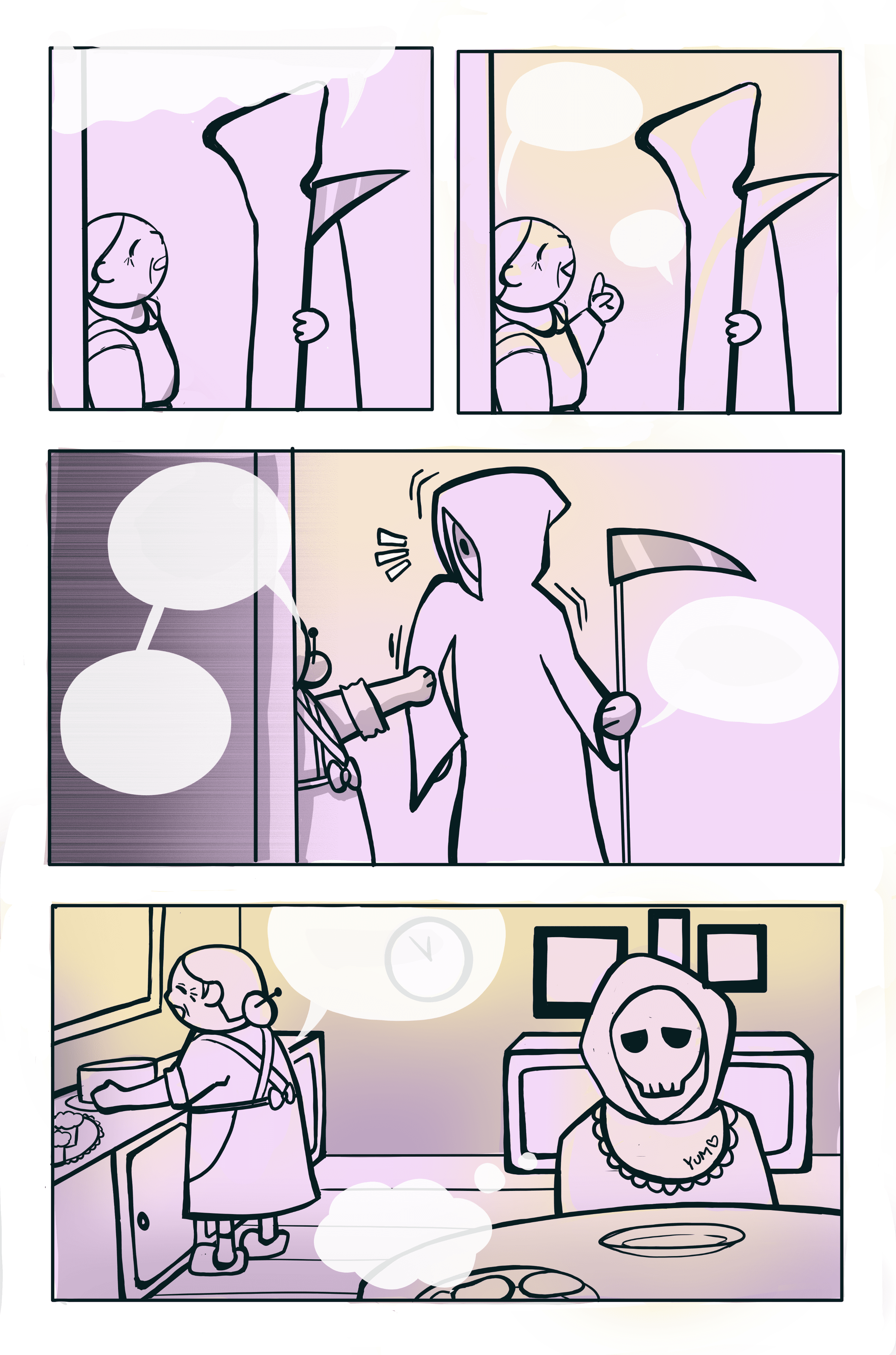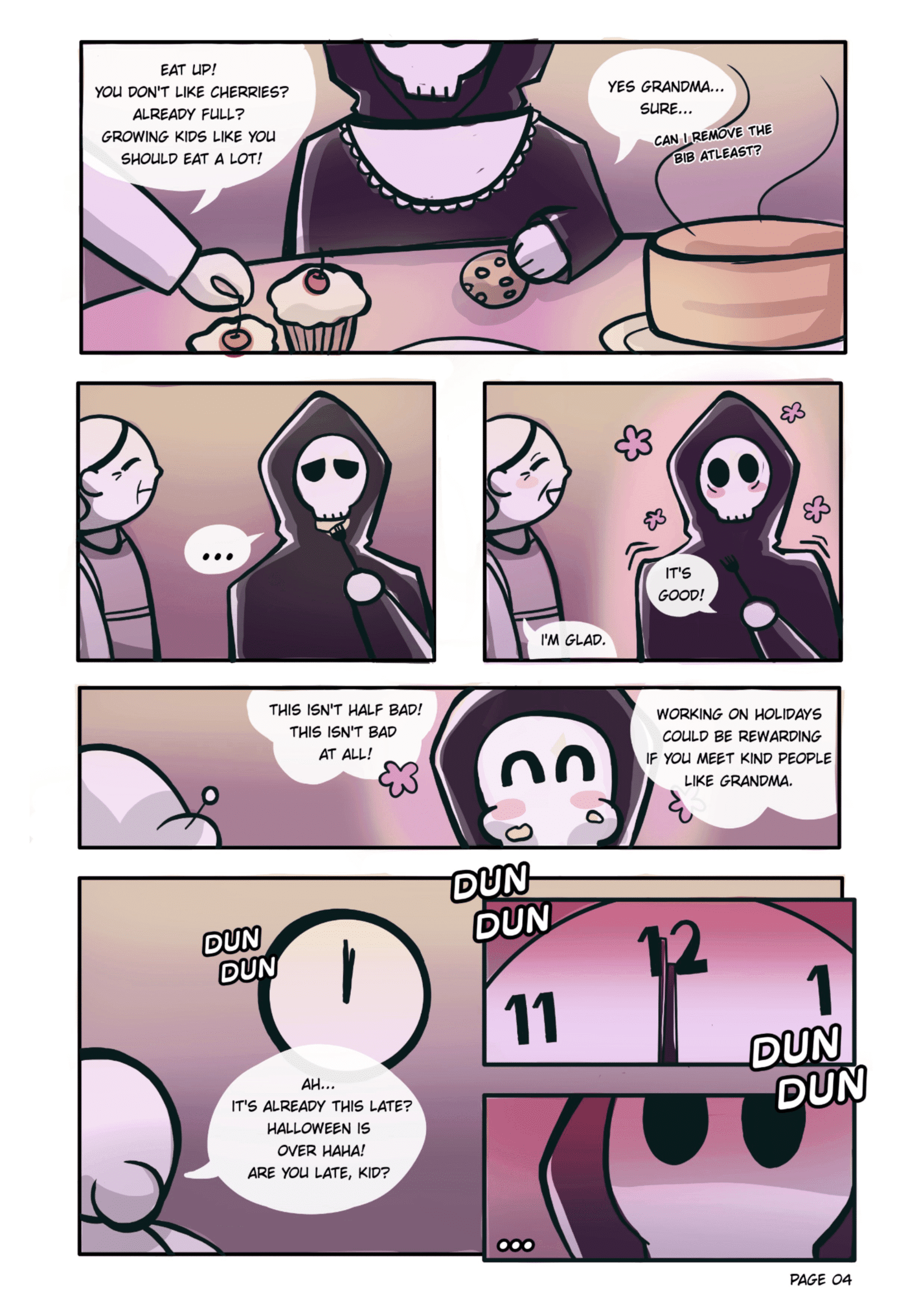 A short comic about a grim reaper vising an old lady on Halloween to take her soul where a misunderstanding leads to a wholesome interaction.