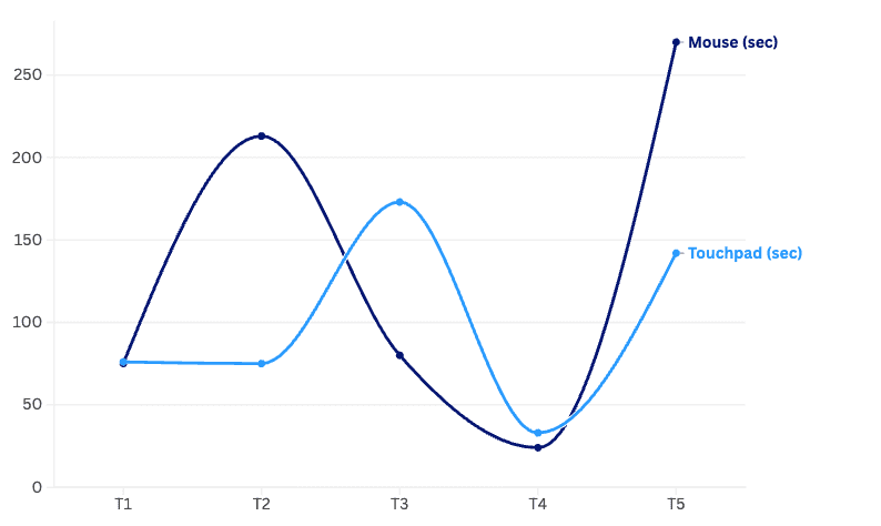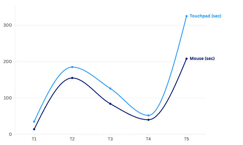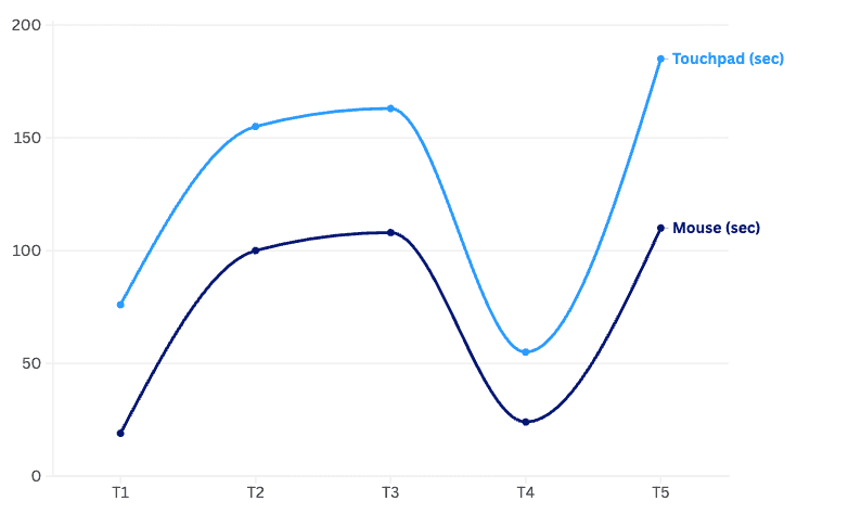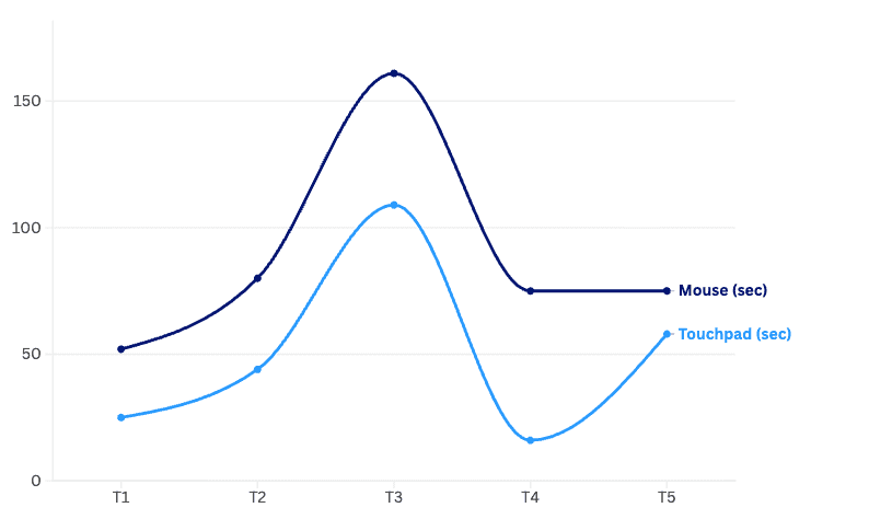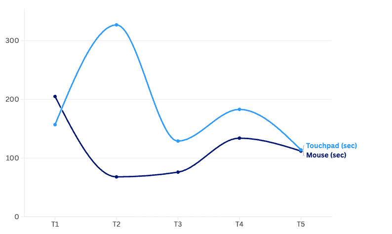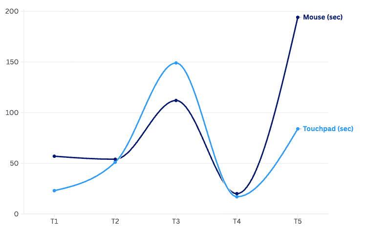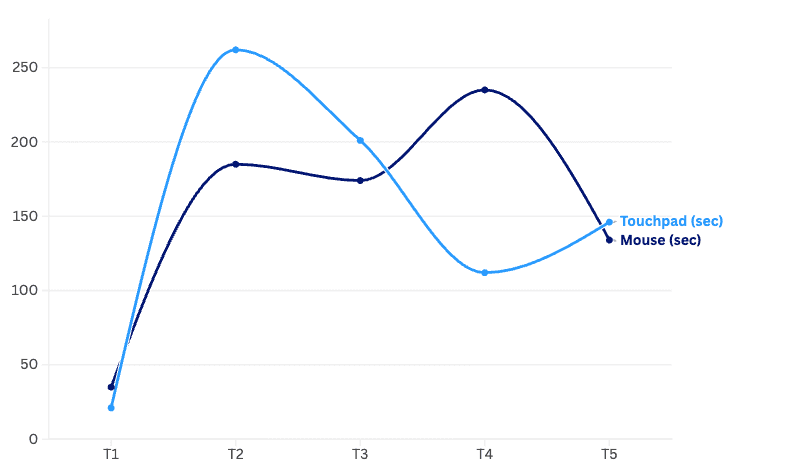 Trackpad shows higher variance in completion times with some tasks much slower and some faster than Mouse.