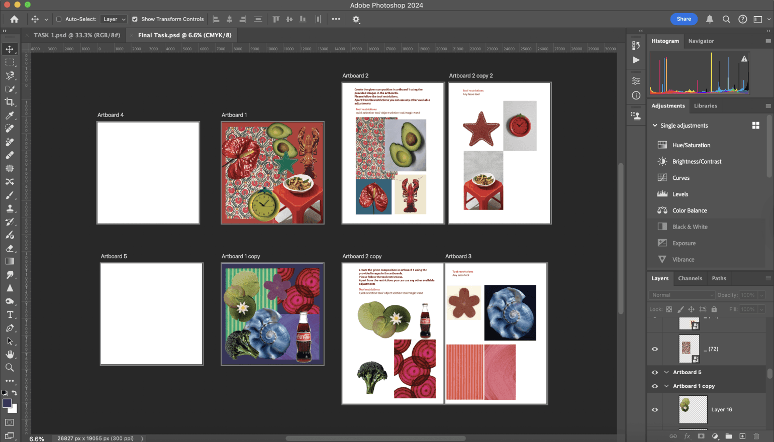 Task 2 combined all those interactions, like selection, masking, layering, and color correction, into one integrated composition to test overall workflow efficiency.