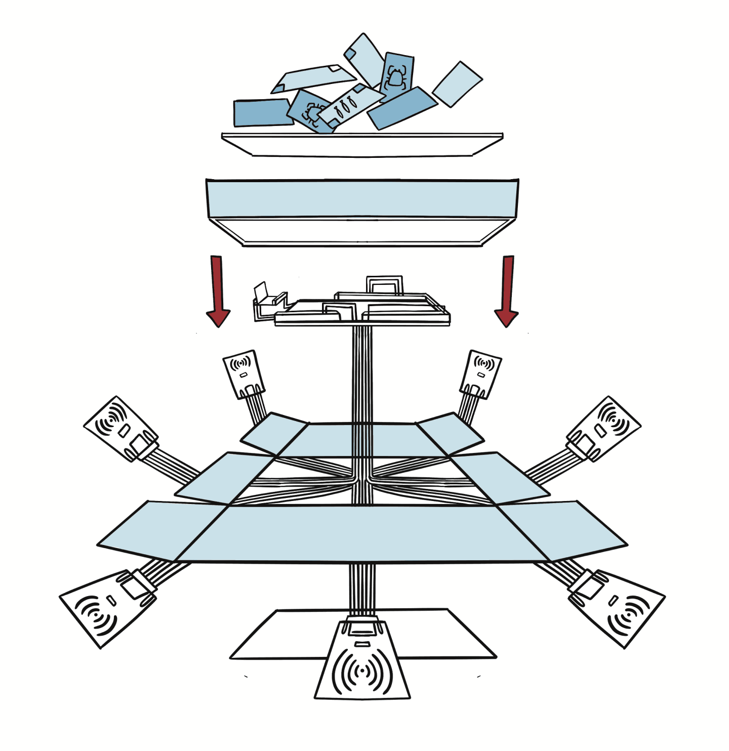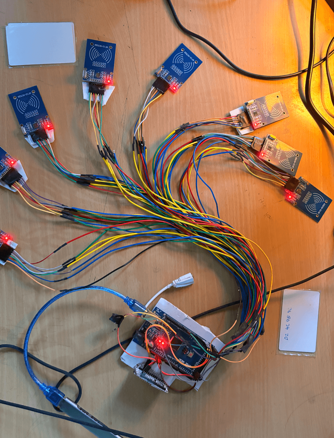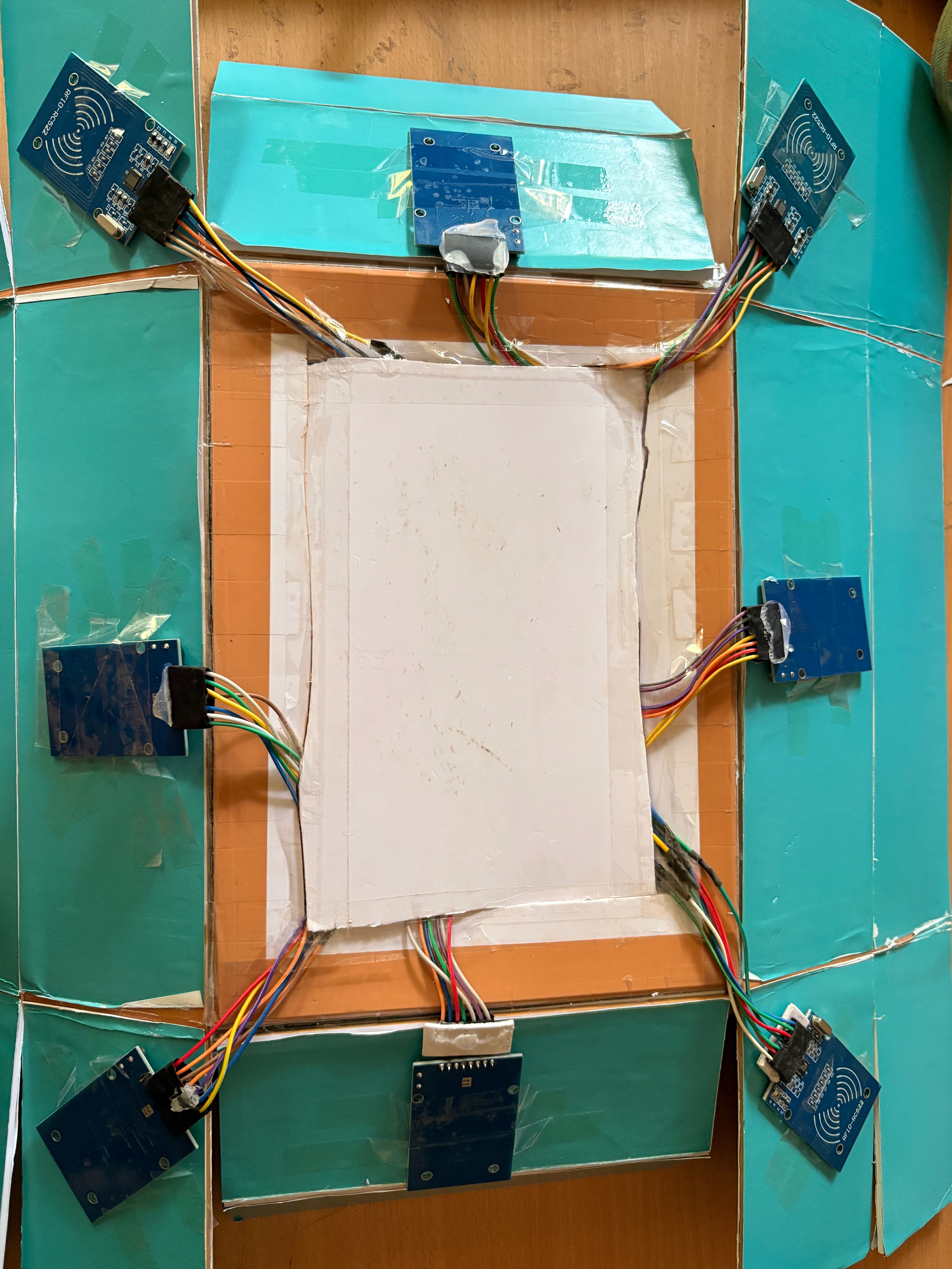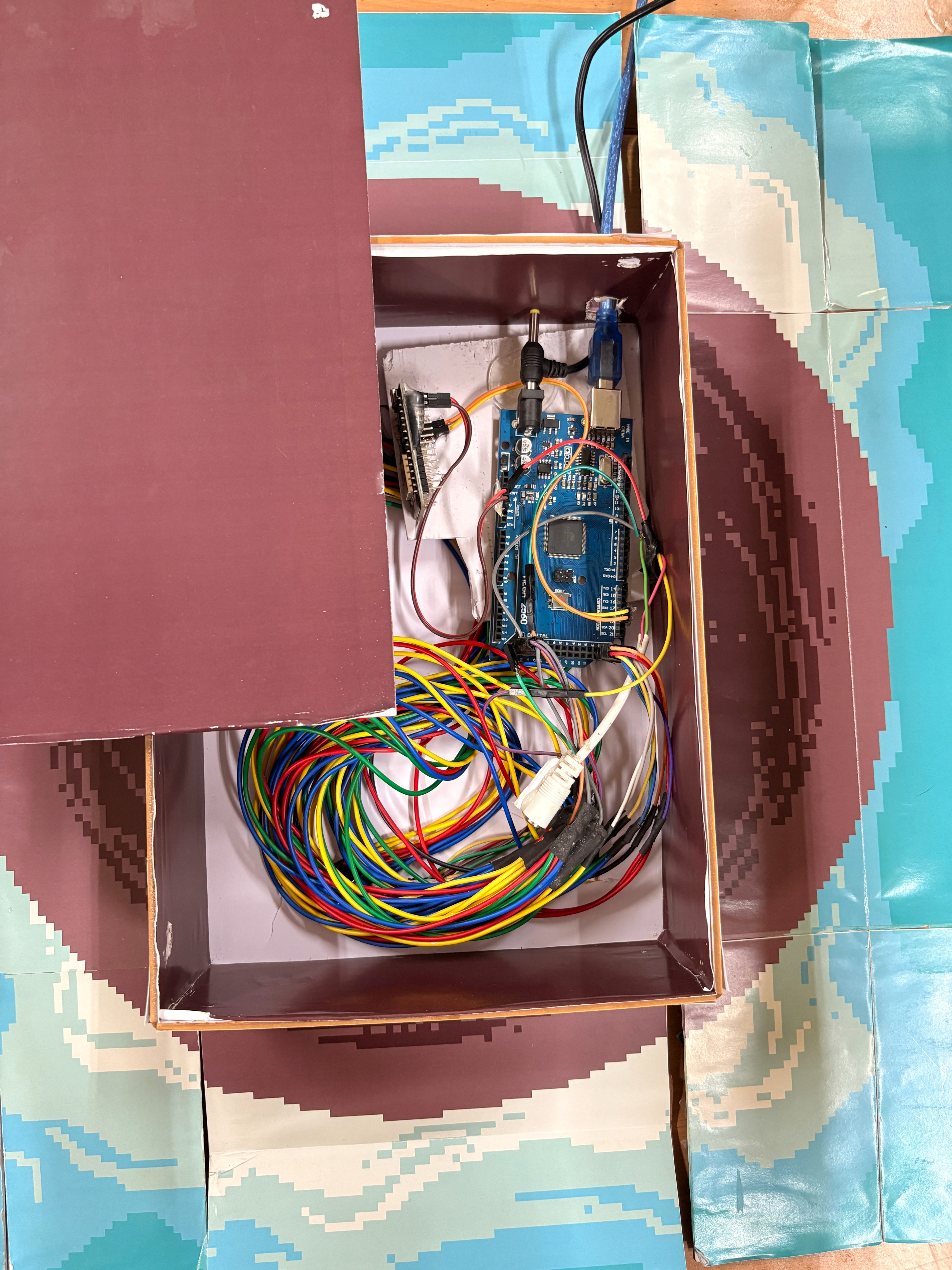 The hardware is stored inside the box connected to the boards
