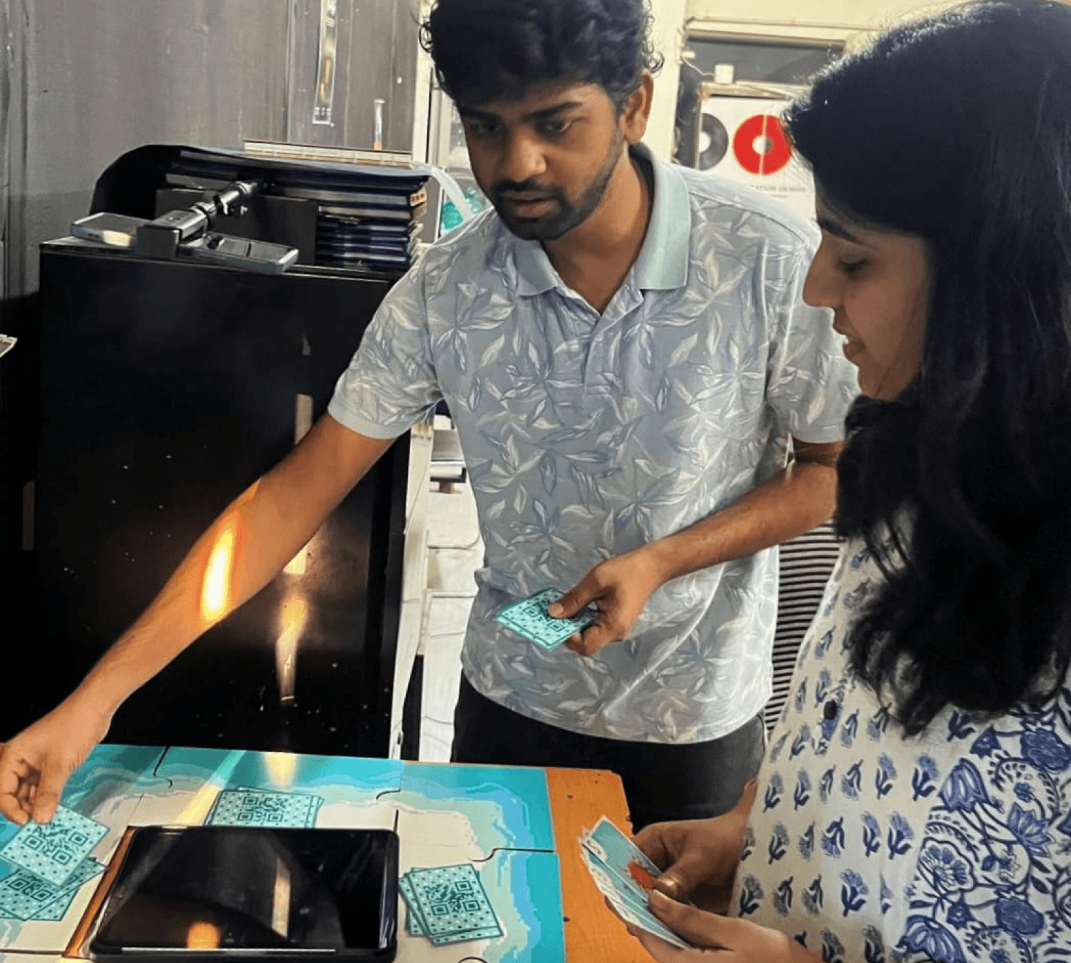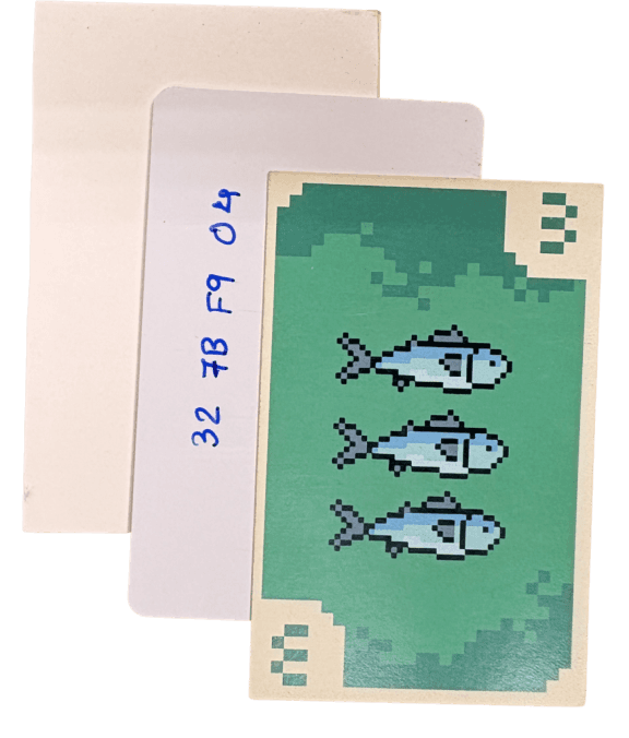 Front depicts and objects with its corresponding heaviness value. Back of each card has a QR with the weight value stored.