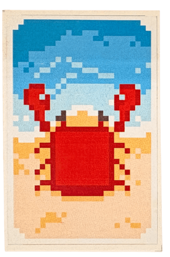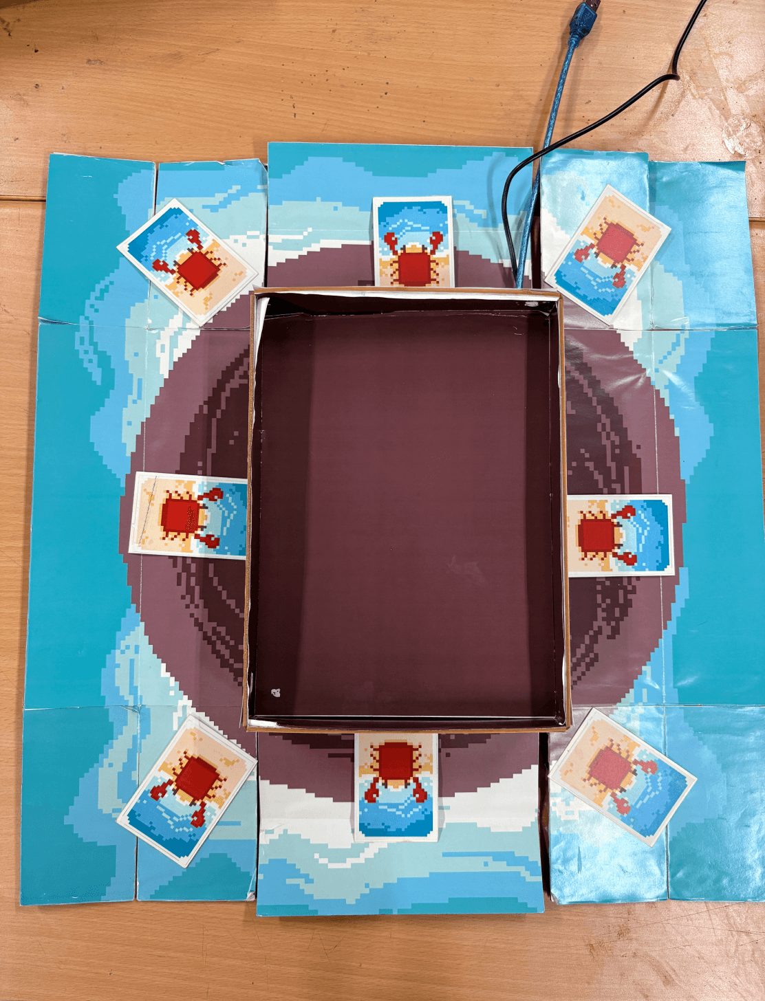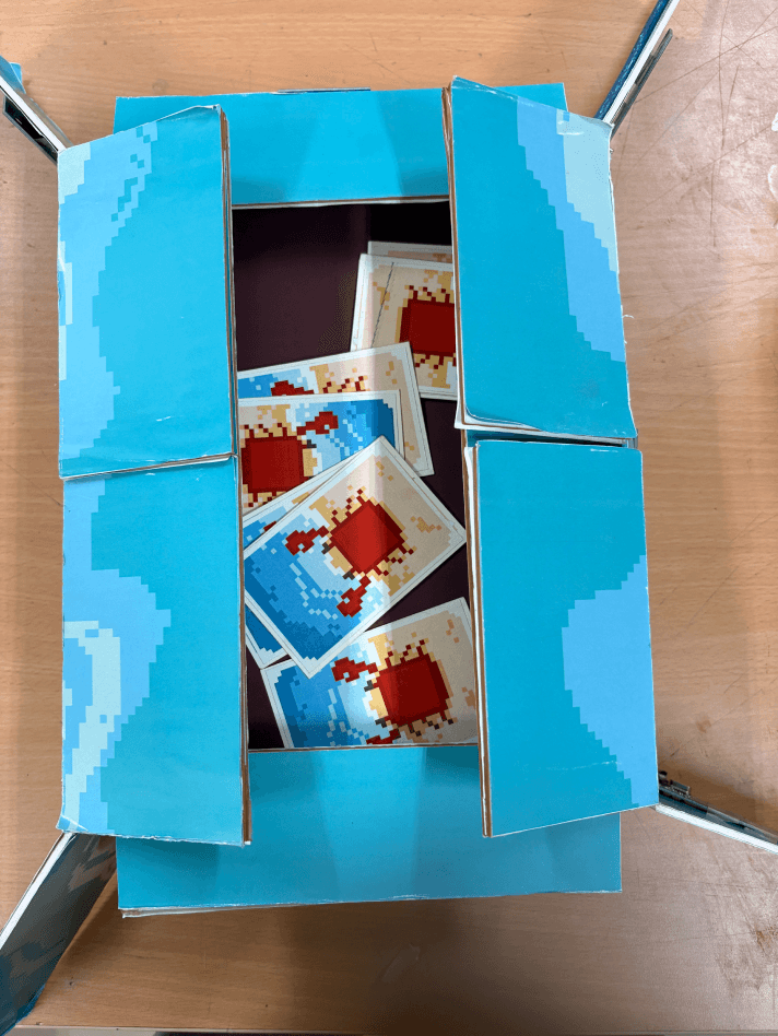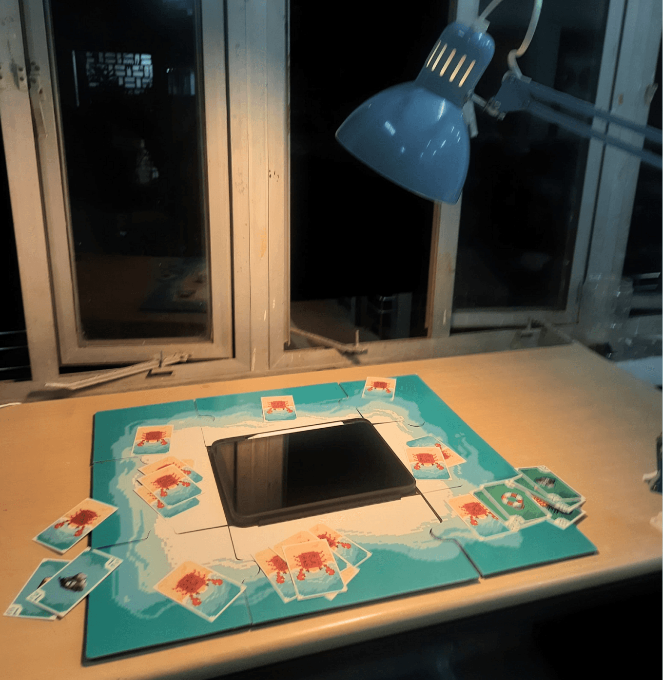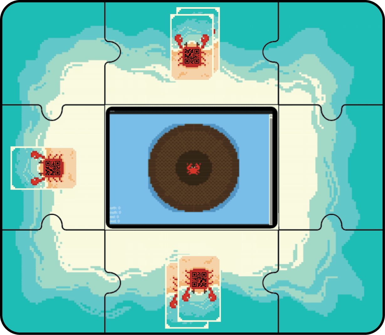 Digital screen placed in the center of the board, displaying the digital raft and a crab on top.