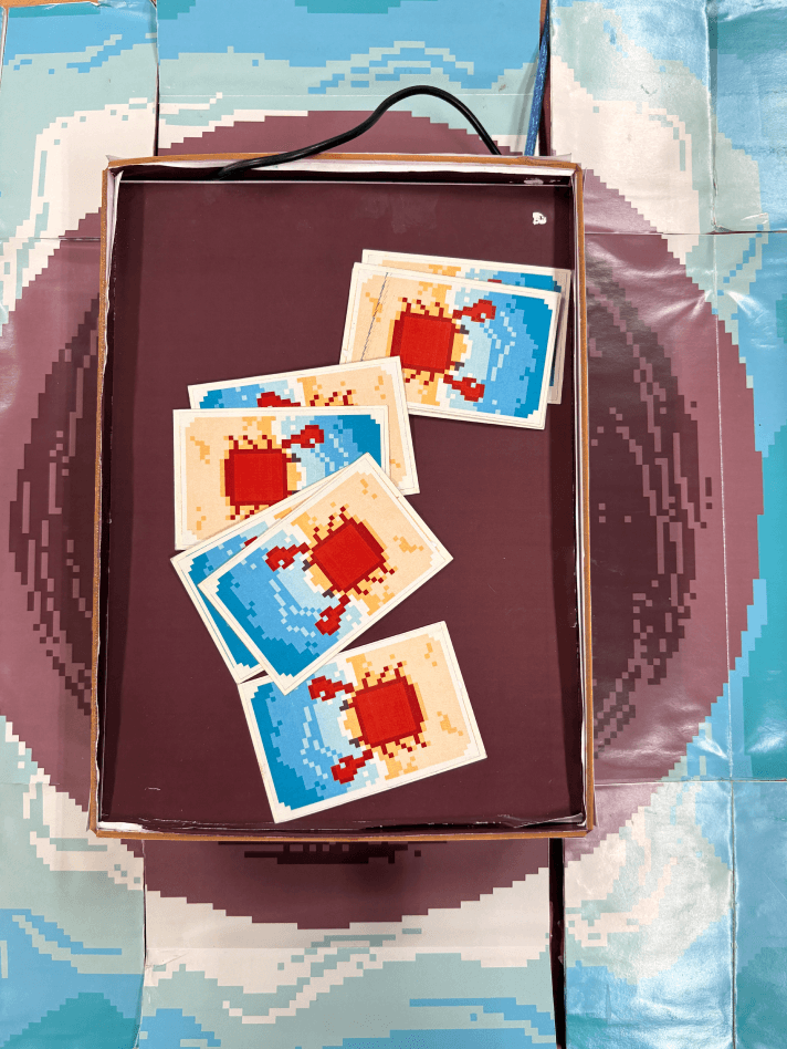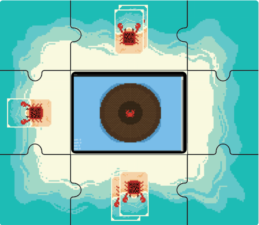 A tangible, collaborative game where players physically balance a virtual raft to trap a crab, blending hands-on interaction with real-time digital feedback.